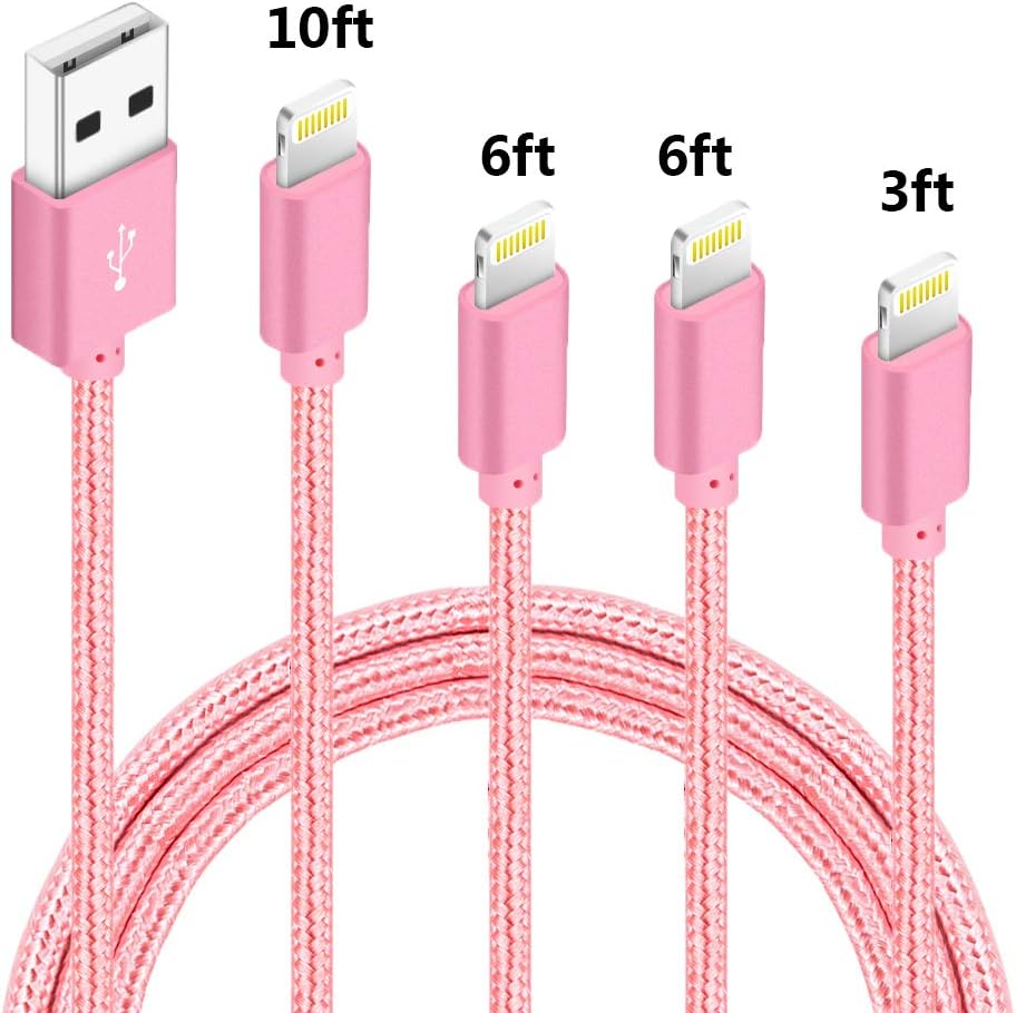 4 Pack (3ft,6ft,6ft,10ft) Nylon Braided Charging Cord Charger Compatible with PhoneX/8/8Plus 7/7 Plus/6s/6s Plus/6/6 Plus/5s/55se,Pad,Pod-Pink